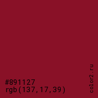 Цвет #891127 в цветовой модели RGB обозначается тремя октетами (137, 17, 39) в десятичном формате и #891127 в шестнадцатиричном (hex) формате, которые являются интенсивностью красного 137 (hex 89), интенсивность зелёного 17 (hex 11) и интенсивность синего 39 (hex 27).