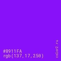 Цвет #8911FA в цветовой модели RGB обозначается тремя октетами (137, 17, 250) в десятичном формате и #8911FA в шестнадцатиричном (hex) формате, которые являются интенсивностью красного 137 (hex 89), интенсивность зелёного 17 (hex 11) и интенсивность синего 250 (hex FA).