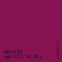 Цвет #891253 в цветовой модели RGB обозначается тремя октетами (137, 18, 83) в десятичном формате и #891253 в шестнадцатиричном (hex) формате, которые являются интенсивностью красного 137 (hex 89), интенсивность зелёного 18 (hex 12) и интенсивность синего 83 (hex 53).