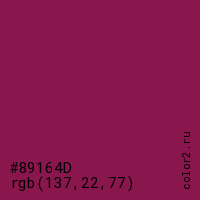 Цвет #89164D в цветовой модели RGB обозначается тремя октетами (137, 22, 77) в десятичном формате и #89164D в шестнадцатиричном (hex) формате, которые являются интенсивностью красного 137 (hex 89), интенсивность зелёного 22 (hex 16) и интенсивность синего 77 (hex 4D).