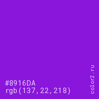 Цвет #8916DA в цветовой модели RGB обозначается тремя октетами (137, 22, 218) в десятичном формате и #8916DA в шестнадцатиричном (hex) формате, которые являются интенсивностью красного 137 (hex 89), интенсивность зелёного 22 (hex 16) и интенсивность синего 218 (hex DA).