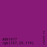 Цвет #891977 в цветовой модели RGB обозначается тремя октетами (137, 25, 119) в десятичном формате и #891977 в шестнадцатиричном (hex) формате, которые являются интенсивностью красного 137 (hex 89), интенсивность зелёного 25 (hex 19) и интенсивность синего 119 (hex 77).