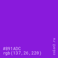 Цвет #891ADC в цветовой модели RGB обозначается тремя октетами (137, 26, 220) в десятичном формате и #891ADC в шестнадцатиричном (hex) формате, которые являются интенсивностью красного 137 (hex 89), интенсивность зелёного 26 (hex 1A) и интенсивность синего 220 (hex DC).