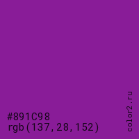Цвет #891C98 в цветовой модели RGB обозначается тремя октетами (137, 28, 152) в десятичном формате и #891C98 в шестнадцатиричном (hex) формате, которые являются интенсивностью красного 137 (hex 89), интенсивность зелёного 28 (hex 1C) и интенсивность синего 152 (hex 98).
