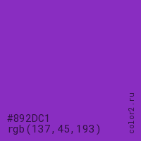 Цвет #892DC1 в цветовой модели RGB обозначается тремя октетами (137, 45, 193) в десятичном формате и #892DC1 в шестнадцатиричном (hex) формате, которые являются интенсивностью красного 137 (hex 89), интенсивность зелёного 45 (hex 2D) и интенсивность синего 193 (hex C1).