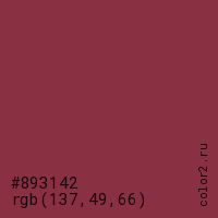 Цвет #893142 в цветовой модели RGB обозначается тремя октетами (137, 49, 66) в десятичном формате и #893142 в шестнадцатиричном (hex) формате, которые являются интенсивностью красного 137 (hex 89), интенсивность зелёного 49 (hex 31) и интенсивность синего 66 (hex 42).