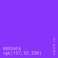 Цвет #8934FA в цветовой модели RGB обозначается тремя октетами (137, 52, 250) в десятичном формате и #8934FA в шестнадцатиричном (hex) формате, которые являются интенсивностью красного 137 (hex 89), интенсивность зелёного 52 (hex 34) и интенсивность синего 250 (hex FA).