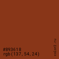 Цвет #893618 в цветовой модели RGB обозначается тремя октетами (137, 54, 24) в десятичном формате и #893618 в шестнадцатиричном (hex) формате, которые являются интенсивностью красного 137 (hex 89), интенсивность зелёного 54 (hex 36) и интенсивность синего 24 (hex 18).