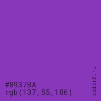 Цвет #8937BA в цветовой модели RGB обозначается тремя октетами (137, 55, 186) в десятичном формате и #8937BA в шестнадцатиричном (hex) формате, которые являются интенсивностью красного 137 (hex 89), интенсивность зелёного 55 (hex 37) и интенсивность синего 186 (hex BA).