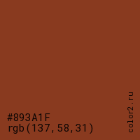 Цвет #893A1F в цветовой модели RGB обозначается тремя октетами (137, 58, 31) в десятичном формате и #893A1F в шестнадцатиричном (hex) формате, которые являются интенсивностью красного 137 (hex 89), интенсивность зелёного 58 (hex 3A) и интенсивность синего 31 (hex 1F).