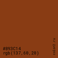 Цвет #893C14 в цветовой модели RGB обозначается тремя октетами (137, 60, 20) в десятичном формате и #893C14 в шестнадцатиричном (hex) формате, которые являются интенсивностью красного 137 (hex 89), интенсивность зелёного 60 (hex 3C) и интенсивность синего 20 (hex 14).
