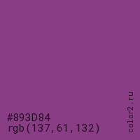 Цвет #893D84 в цветовой модели RGB обозначается тремя октетами (137, 61, 132) в десятичном формате и #893D84 в шестнадцатиричном (hex) формате, которые являются интенсивностью красного 137 (hex 89), интенсивность зелёного 61 (hex 3D) и интенсивность синего 132 (hex 84).