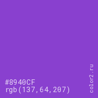 Цвет #8940CF в цветовой модели RGB обозначается тремя октетами (137, 64, 207) в десятичном формате и #8940CF в шестнадцатиричном (hex) формате, которые являются интенсивностью красного 137 (hex 89), интенсивность зелёного 64 (hex 40) и интенсивность синего 207 (hex CF).