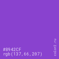 Цвет #8942CF в цветовой модели RGB обозначается тремя октетами (137, 66, 207) в десятичном формате и #8942CF в шестнадцатиричном (hex) формате, которые являются интенсивностью красного 137 (hex 89), интенсивность зелёного 66 (hex 42) и интенсивность синего 207 (hex CF).