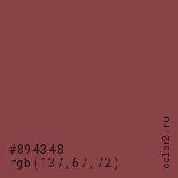 Цвет #894348 в цветовой модели RGB обозначается тремя октетами (137, 67, 72) в десятичном формате и #894348 в шестнадцатиричном (hex) формате, которые являются интенсивностью красного 137 (hex 89), интенсивность зелёного 67 (hex 43) и интенсивность синего 72 (hex 48).