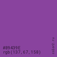 Цвет #89439E в цветовой модели RGB обозначается тремя октетами (137, 67, 158) в десятичном формате и #89439E в шестнадцатиричном (hex) формате, которые являются интенсивностью красного 137 (hex 89), интенсивность зелёного 67 (hex 43) и интенсивность синего 158 (hex 9E).
