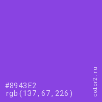 Цвет #8943E2 в цветовой модели RGB обозначается тремя октетами (137, 67, 226) в десятичном формате и #8943E2 в шестнадцатиричном (hex) формате, которые являются интенсивностью красного 137 (hex 89), интенсивность зелёного 67 (hex 43) и интенсивность синего 226 (hex E2).