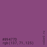 Цвет #89477D в цветовой модели RGB обозначается тремя октетами (137, 71, 125) в десятичном формате и #89477D в шестнадцатиричном (hex) формате, которые являются интенсивностью красного 137 (hex 89), интенсивность зелёного 71 (hex 47) и интенсивность синего 125 (hex 7D).