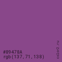Цвет #89478A в цветовой модели RGB обозначается тремя октетами (137, 71, 138) в десятичном формате и #89478A в шестнадцатиричном (hex) формате, которые являются интенсивностью красного 137 (hex 89), интенсивность зелёного 71 (hex 47) и интенсивность синего 138 (hex 8A).
