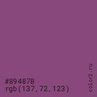 Цвет #89487B в цветовой модели RGB обозначается тремя октетами (137, 72, 123) в десятичном формате и #89487B в шестнадцатиричном (hex) формате, которые являются интенсивностью красного 137 (hex 89), интенсивность зелёного 72 (hex 48) и интенсивность синего 123 (hex 7B).