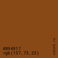 Цвет #894917 в цветовой модели RGB обозначается тремя октетами (137, 73, 23) в десятичном формате и #894917 в шестнадцатиричном (hex) формате, которые являются интенсивностью красного 137 (hex 89), интенсивность зелёного 73 (hex 49) и интенсивность синего 23 (hex 17).