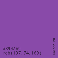 Цвет #894AA9 в цветовой модели RGB обозначается тремя октетами (137, 74, 169) в десятичном формате и #894AA9 в шестнадцатиричном (hex) формате, которые являются интенсивностью красного 137 (hex 89), интенсивность зелёного 74 (hex 4A) и интенсивность синего 169 (hex A9).