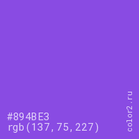 Цвет #894BE3 в цветовой модели RGB обозначается тремя октетами (137, 75, 227) в десятичном формате и #894BE3 в шестнадцатиричном (hex) формате, которые являются интенсивностью красного 137 (hex 89), интенсивность зелёного 75 (hex 4B) и интенсивность синего 227 (hex E3).