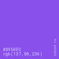 Цвет #8950EC в цветовой модели RGB обозначается тремя октетами (137, 80, 236) в десятичном формате и #8950EC в шестнадцатиричном (hex) формате, которые являются интенсивностью красного 137 (hex 89), интенсивность зелёного 80 (hex 50) и интенсивность синего 236 (hex EC).