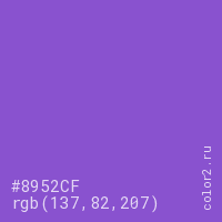 Цвет #8952CF в цветовой модели RGB обозначается тремя октетами (137, 82, 207) в десятичном формате и #8952CF в шестнадцатиричном (hex) формате, которые являются интенсивностью красного 137 (hex 89), интенсивность зелёного 82 (hex 52) и интенсивность синего 207 (hex CF).