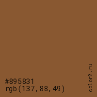 Цвет #895831 в цветовой модели RGB обозначается тремя октетами (137, 88, 49) в десятичном формате и #895831 в шестнадцатиричном (hex) формате, которые являются интенсивностью красного 137 (hex 89), интенсивность зелёного 88 (hex 58) и интенсивность синего 49 (hex 31).