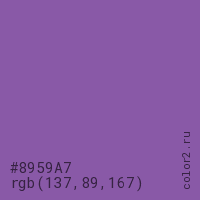 Цвет #8959A7 в цветовой модели RGB обозначается тремя октетами (137, 89, 167) в десятичном формате и #8959A7 в шестнадцатиричном (hex) формате, которые являются интенсивностью красного 137 (hex 89), интенсивность зелёного 89 (hex 59) и интенсивность синего 167 (hex A7).