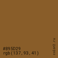 Цвет #895D29 в цветовой модели RGB обозначается тремя октетами (137, 93, 41) в десятичном формате и #895D29 в шестнадцатиричном (hex) формате, которые являются интенсивностью красного 137 (hex 89), интенсивность зелёного 93 (hex 5D) и интенсивность синего 41 (hex 29).