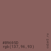 Цвет #89605D в цветовой модели RGB обозначается тремя октетами (137, 96, 93) в десятичном формате и #89605D в шестнадцатиричном (hex) формате, которые являются интенсивностью красного 137 (hex 89), интенсивность зелёного 96 (hex 60) и интенсивность синего 93 (hex 5D).