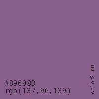 Цвет #89608B в цветовой модели RGB обозначается тремя октетами (137, 96, 139) в десятичном формате и #89608B в шестнадцатиричном (hex) формате, которые являются интенсивностью красного 137 (hex 89), интенсивность зелёного 96 (hex 60) и интенсивность синего 139 (hex 8B).