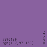 Цвет #89619F в цветовой модели RGB обозначается тремя октетами (137, 97, 159) в десятичном формате и #89619F в шестнадцатиричном (hex) формате, которые являются интенсивностью красного 137 (hex 89), интенсивность зелёного 97 (hex 61) и интенсивность синего 159 (hex 9F).