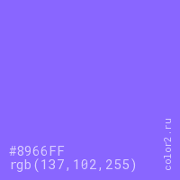 Цвет #8966FF в цветовой модели RGB обозначается тремя октетами (137, 102, 255) в десятичном формате и #8966FF в шестнадцатиричном (hex) формате, которые являются интенсивностью красного 137 (hex 89), интенсивность зелёного 102 (hex 66) и интенсивность синего 255 (hex FF).