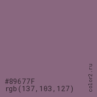 Цвет #89677F в цветовой модели RGB обозначается тремя октетами (137, 103, 127) в десятичном формате и #89677F в шестнадцатиричном (hex) формате, которые являются интенсивностью красного 137 (hex 89), интенсивность зелёного 103 (hex 67) и интенсивность синего 127 (hex 7F).
