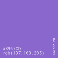 Цвет #8967CD в цветовой модели RGB обозначается тремя октетами (137, 103, 205) в десятичном формате и #8967CD в шестнадцатиричном (hex) формате, которые являются интенсивностью красного 137 (hex 89), интенсивность зелёного 103 (hex 67) и интенсивность синего 205 (hex CD).