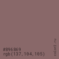 Цвет #896869 в цветовой модели RGB обозначается тремя октетами (137, 104, 105) в десятичном формате и #896869 в шестнадцатиричном (hex) формате, которые являются интенсивностью красного 137 (hex 89), интенсивность зелёного 104 (hex 68) и интенсивность синего 105 (hex 69).