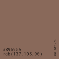 Цвет #89695A в цветовой модели RGB обозначается тремя октетами (137, 105, 90) в десятичном формате и #89695A в шестнадцатиричном (hex) формате, которые являются интенсивностью красного 137 (hex 89), интенсивность зелёного 105 (hex 69) и интенсивность синего 90 (hex 5A).