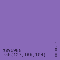 Цвет #8969B8 в цветовой модели RGB обозначается тремя октетами (137, 105, 184) в десятичном формате и #8969B8 в шестнадцатиричном (hex) формате, которые являются интенсивностью красного 137 (hex 89), интенсивность зелёного 105 (hex 69) и интенсивность синего 184 (hex B8).