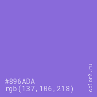 Цвет #896ADA в цветовой модели RGB обозначается тремя октетами (137, 106, 218) в десятичном формате и #896ADA в шестнадцатиричном (hex) формате, которые являются интенсивностью красного 137 (hex 89), интенсивность зелёного 106 (hex 6A) и интенсивность синего 218 (hex DA).