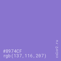 Цвет #8974CF в цветовой модели RGB обозначается тремя октетами (137, 116, 207) в десятичном формате и #8974CF в шестнадцатиричном (hex) формате, которые являются интенсивностью красного 137 (hex 89), интенсивность зелёного 116 (hex 74) и интенсивность синего 207 (hex CF).