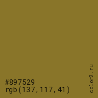 Цвет #897529 в цветовой модели RGB обозначается тремя октетами (137, 117, 41) в десятичном формате и #897529 в шестнадцатиричном (hex) формате, которые являются интенсивностью красного 137 (hex 89), интенсивность зелёного 117 (hex 75) и интенсивность синего 41 (hex 29).