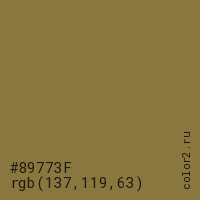 Цвет #89773F в цветовой модели RGB обозначается тремя октетами (137, 119, 63) в десятичном формате и #89773F в шестнадцатиричном (hex) формате, которые являются интенсивностью красного 137 (hex 89), интенсивность зелёного 119 (hex 77) и интенсивность синего 63 (hex 3F).