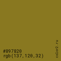 Цвет #897820 в цветовой модели RGB обозначается тремя октетами (137, 120, 32) в десятичном формате и #897820 в шестнадцатиричном (hex) формате, которые являются интенсивностью красного 137 (hex 89), интенсивность зелёного 120 (hex 78) и интенсивность синего 32 (hex 20).