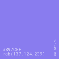 Цвет #897CEF в цветовой модели RGB обозначается тремя октетами (137, 124, 239) в десятичном формате и #897CEF в шестнадцатиричном (hex) формате, которые являются интенсивностью красного 137 (hex 89), интенсивность зелёного 124 (hex 7C) и интенсивность синего 239 (hex EF).