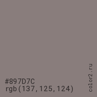 Цвет #897D7C в цветовой модели RGB обозначается тремя октетами (137, 125, 124) в десятичном формате и #897D7C в шестнадцатиричном (hex) формате, которые являются интенсивностью красного 137 (hex 89), интенсивность зелёного 125 (hex 7D) и интенсивность синего 124 (hex 7C).
