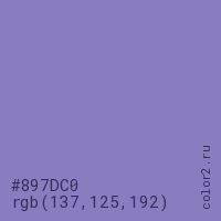 Цвет #897DC0 в цветовой модели RGB обозначается тремя октетами (137, 125, 192) в десятичном формате и #897DC0 в шестнадцатиричном (hex) формате, которые являются интенсивностью красного 137 (hex 89), интенсивность зелёного 125 (hex 7D) и интенсивность синего 192 (hex C0).