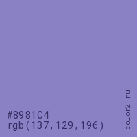 Цвет #8981C4 в цветовой модели RGB обозначается тремя октетами (137, 129, 196) в десятичном формате и #8981C4 в шестнадцатиричном (hex) формате, которые являются интенсивностью красного 137 (hex 89), интенсивность зелёного 129 (hex 81) и интенсивность синего 196 (hex C4).